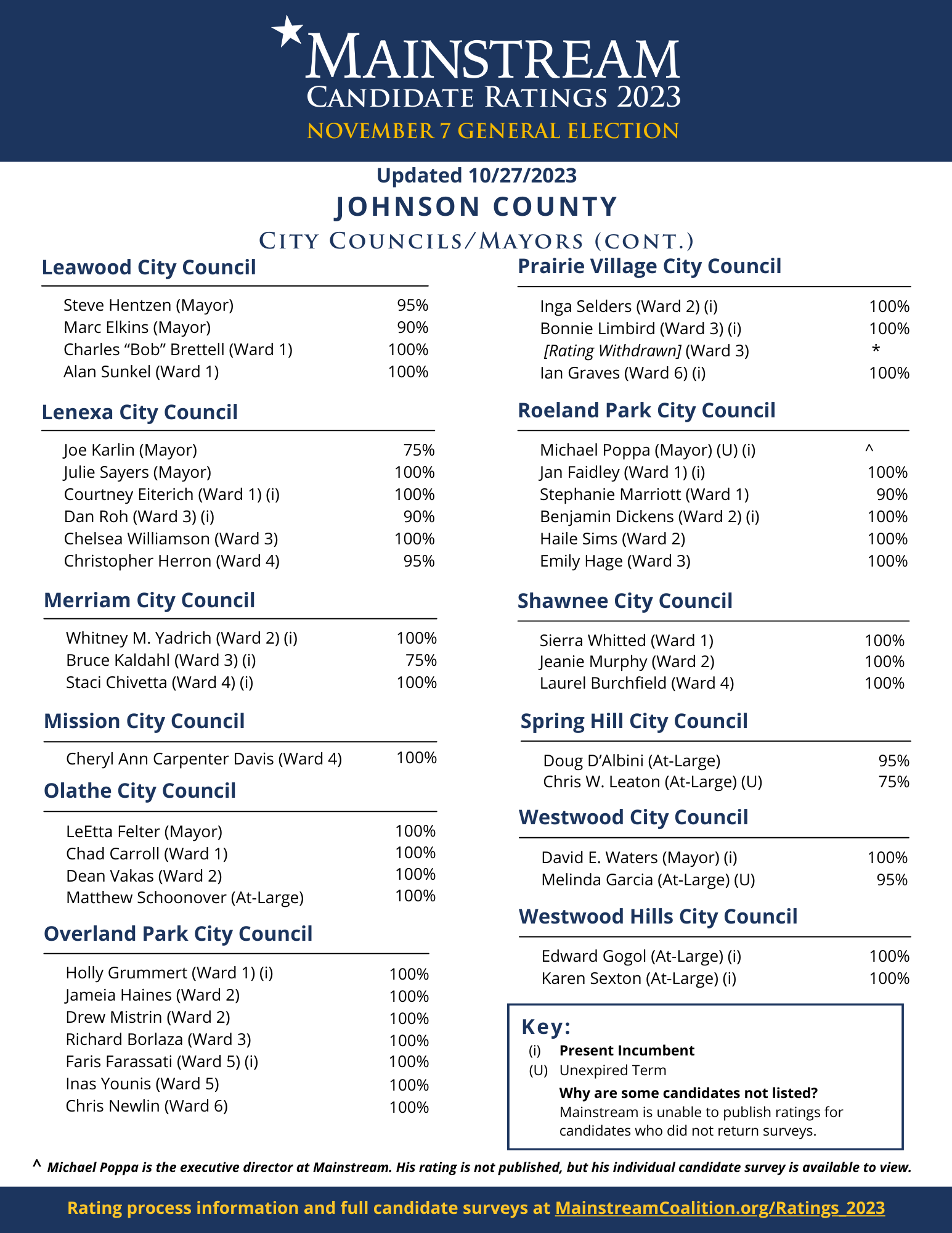 Lori Sharp, candidate for Prairie Village City Council Ward 3, is not a Mainstream Candidate. Her platform seeking to limit representation in government and overturn the will of voters is not consistent with Mainstream’s values. Therefore, Ms. Sharp’s self-reported rating and completed survey have been withdrawn from our site and candidate scorecard.