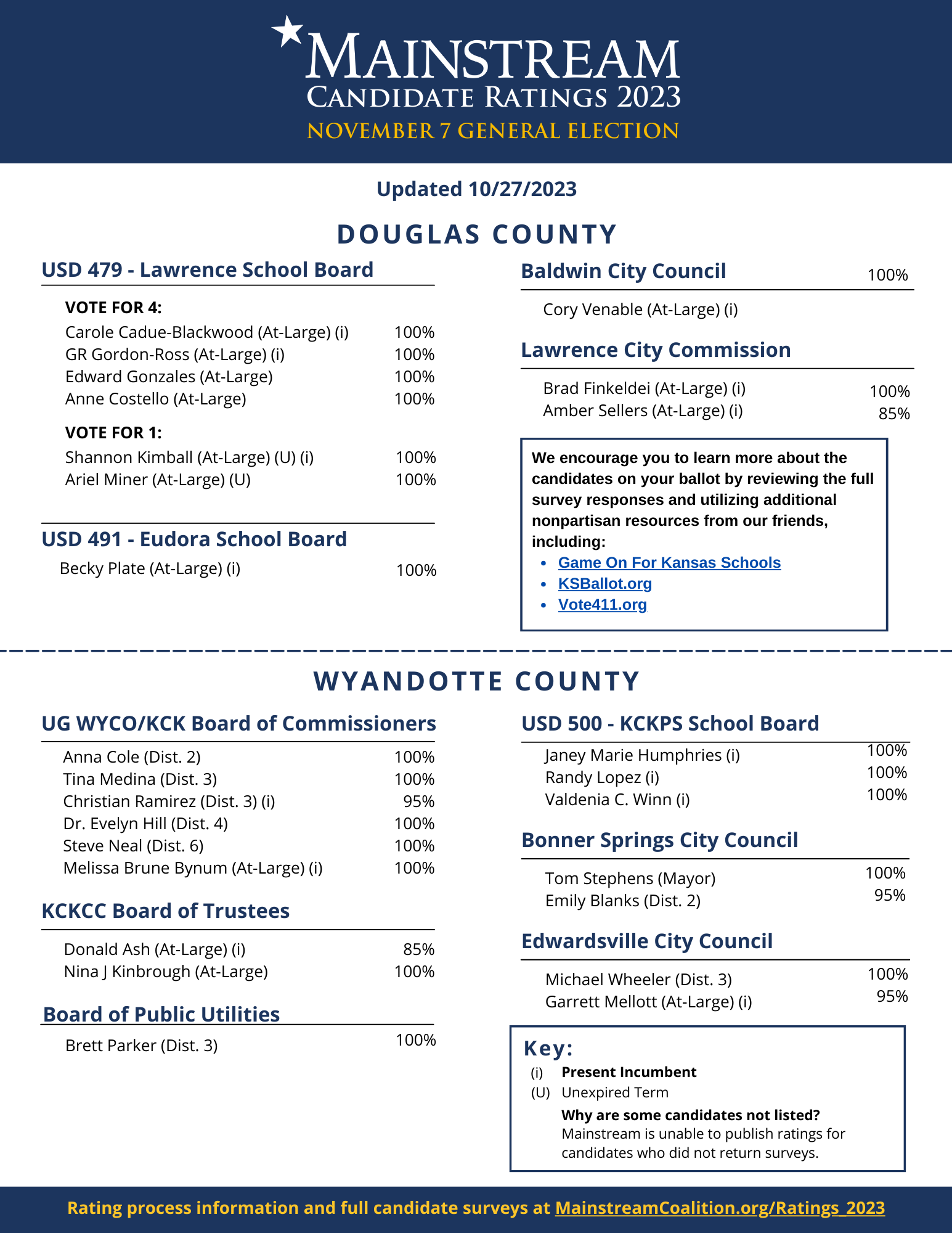 While every issue may not directly relate to an office sought by a candidate, the survey questions are based on legislation and issues from the 2023 session that have profound impacts on local governing bodies and the communities they serve. Our candidate ratings, shown as percentages, are designed to provide voters with an indication of how closely a candidate might align with Mainstream values (the higher the rating percentage, the greater the likelihood).